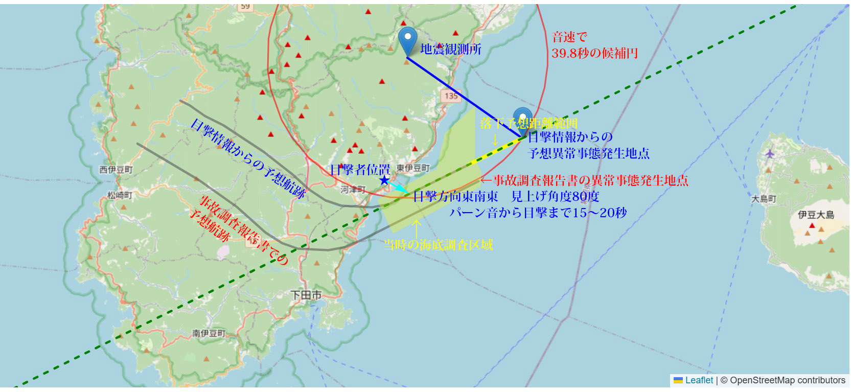 ・目撃情報から地震研究所の微気圧振動観測を考慮して本考察で最も可能性が高いと推定した航路。事故調査報告書の航路との比較