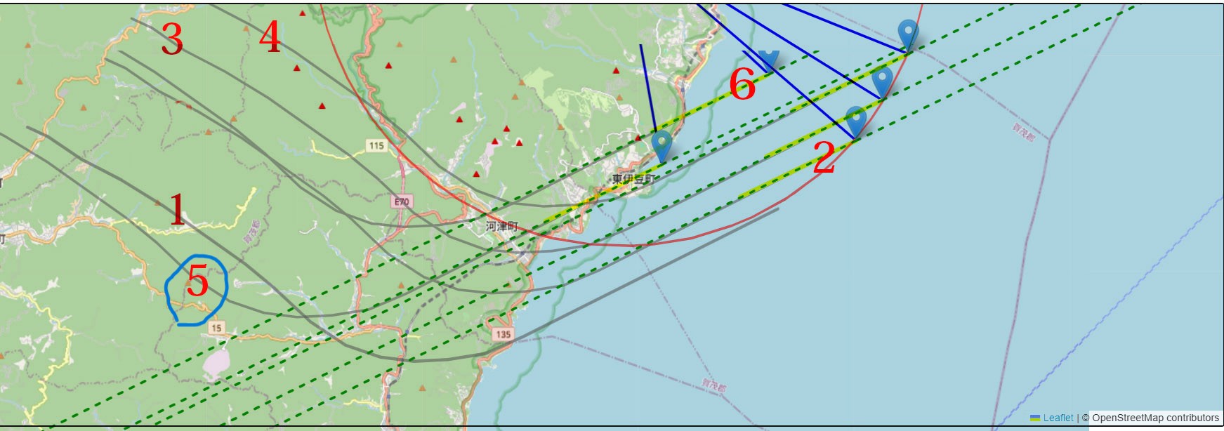 この質問をした時点では方角等の目撃情報をまだ未確認の時点のため、可能性の高そうなさまざまな航路を候補としてます。