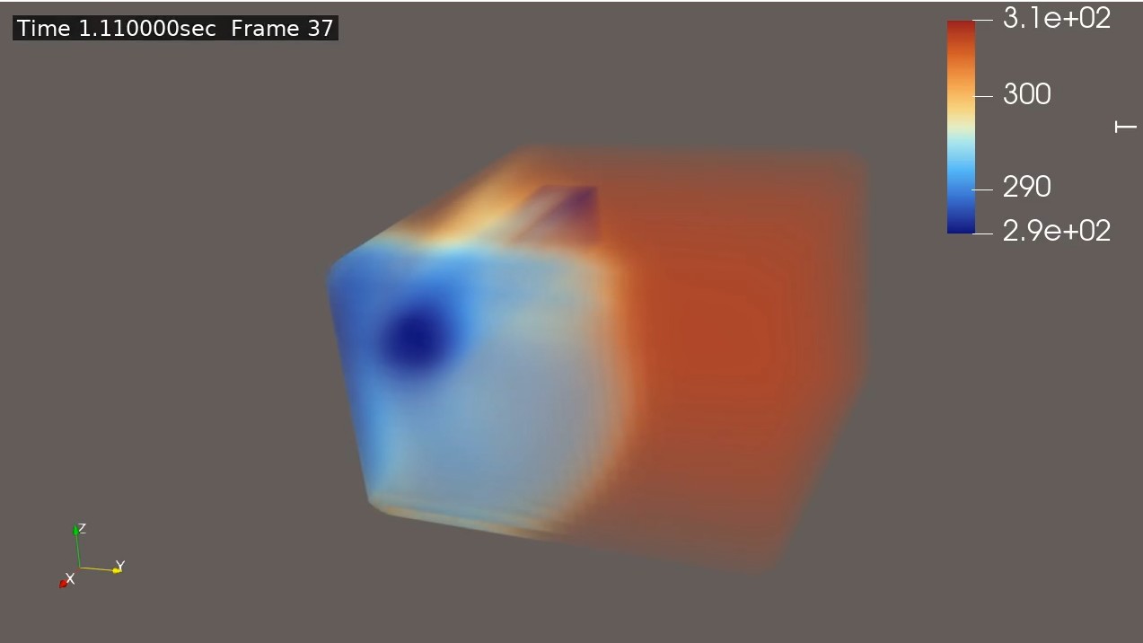ParaView上でT(気温[単位ケルビン])をボリュームレンダリングをしてます。