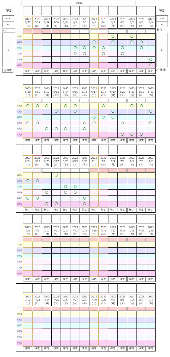 日程表を横に3分割して2分割目の開始位置の日付には*印が付いてます。集計やAIでの作成を行う際に、どの月に対して行うかを*の日付の月で判断してます。