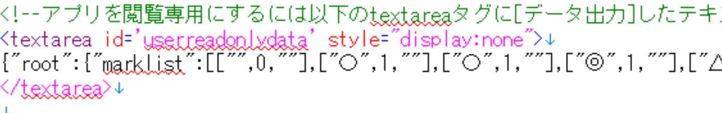 テキスト文字列を読み込みには、データ出力されたテキスト文字列を左欄に記述してから[データ読込]ボタンを押します。編集のデータが破棄される注意メッセージが表示されます。[OK]ボタンを押すと読み込みます。