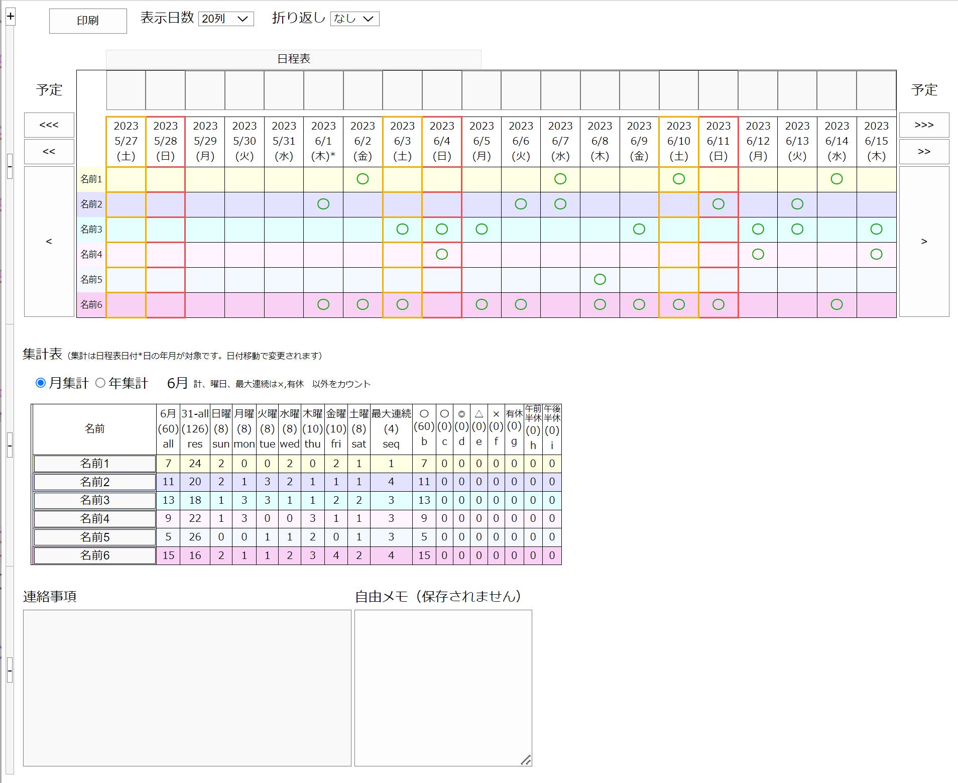 シフト表、勤務表、出欠表などの表を簡単操作で作成できるブラウザで動作する無料アプリです。様々なOS上で動作します。