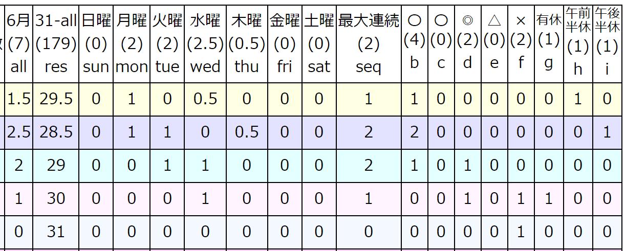 (日曜が3以上でかつ最大連続が4未満)または◎が6 の場合の例 ( sun>=3 & seq<4 ) | d=6