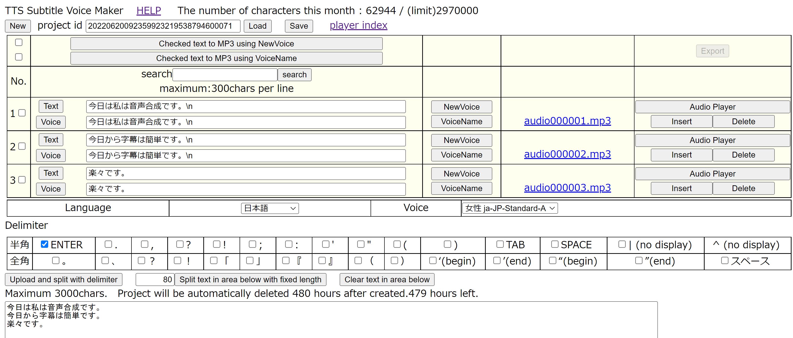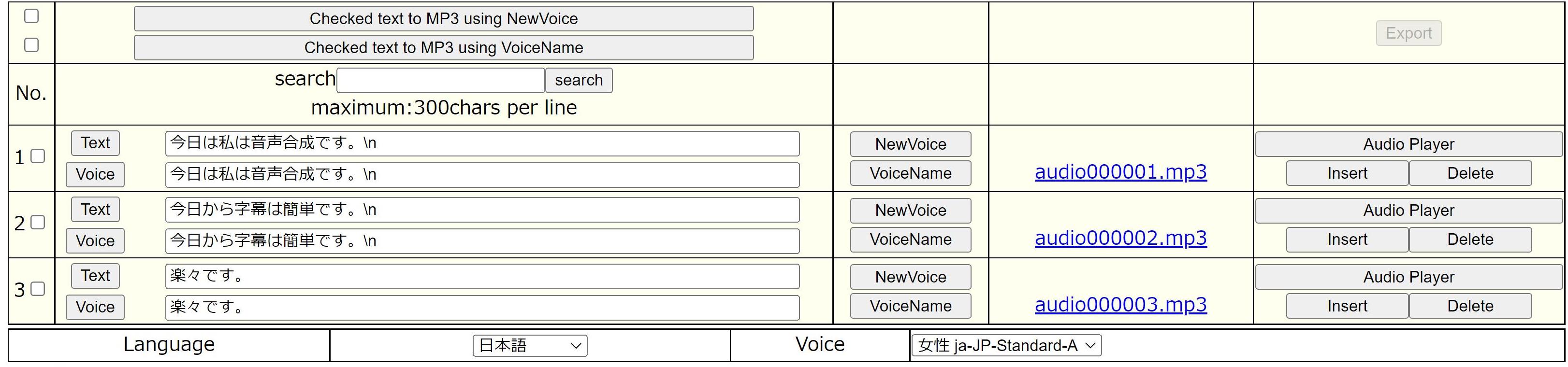 次に、文節のリストの上部の[Checked text to MP3 using NewVoice]ボタンを押します。これで数秒で音声合成のMP3ファイルが作成されます。実際にGoogle Cloud Platformのサーバーを利用してます。