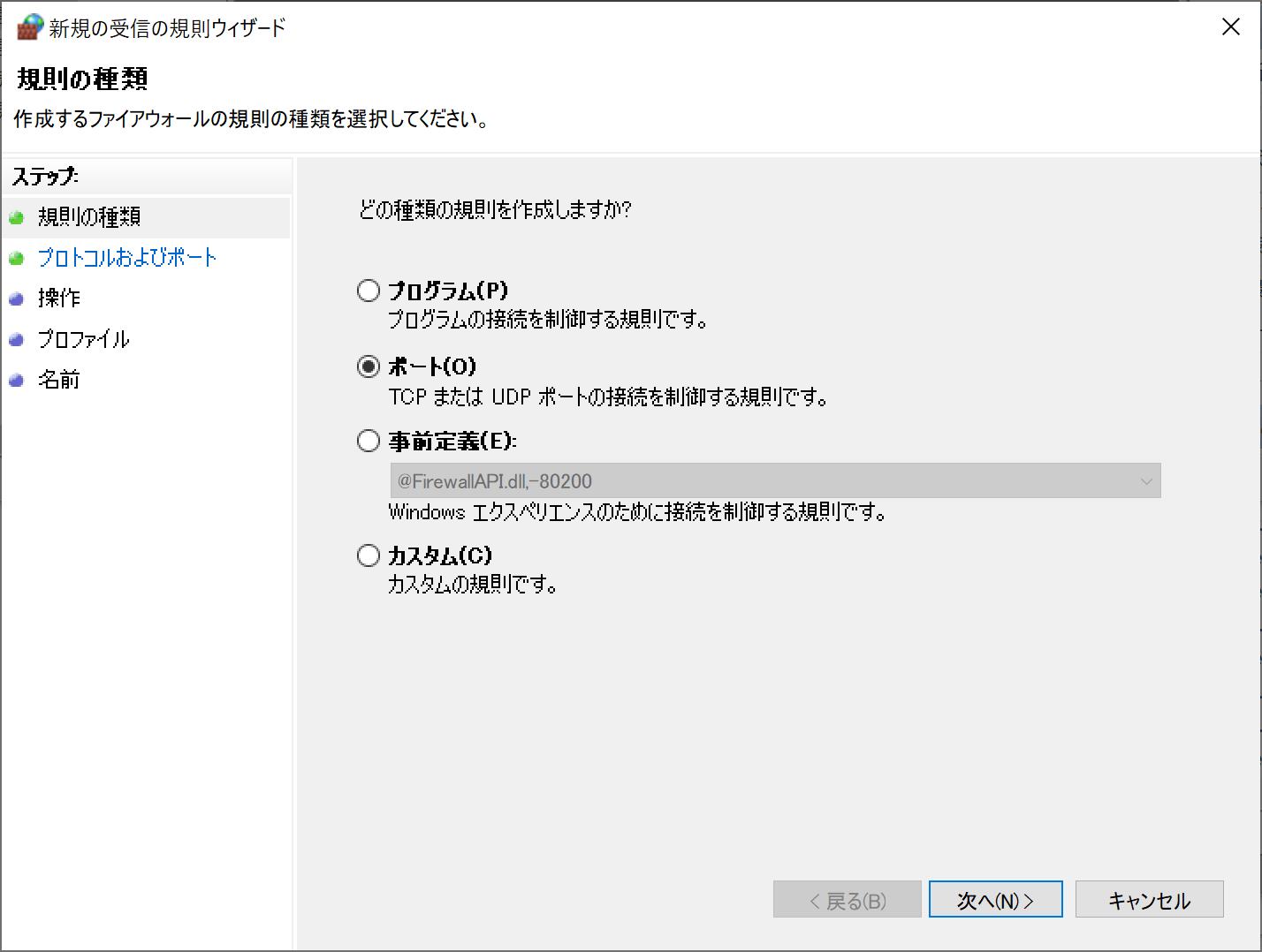| ”ポート”を選択して「次へ」ボタンをクリックします。 |