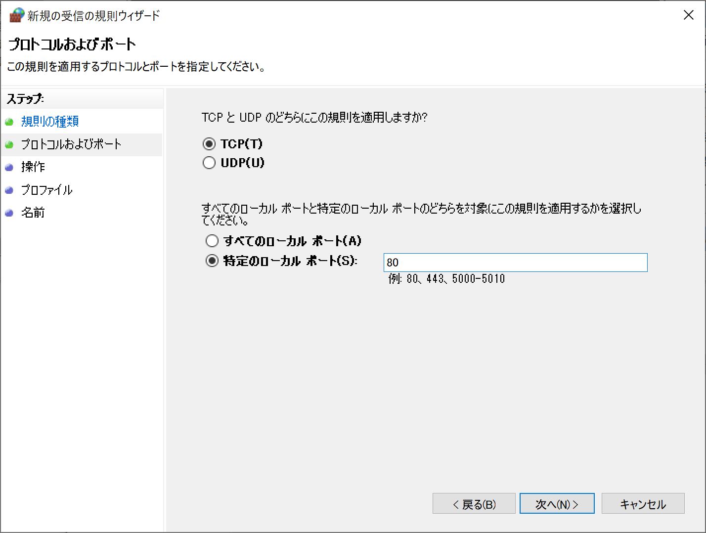 | ”TCP”を選択。”特定のローカルポート”を選択してWebサーバのポート番号の80を入力して、「次へ」ボタンをクリックします。(環境変数で"SERVER_PORT"を作成して番号を記載してポート番号を変更可能です。その場合は設定した番号を記載します。) |