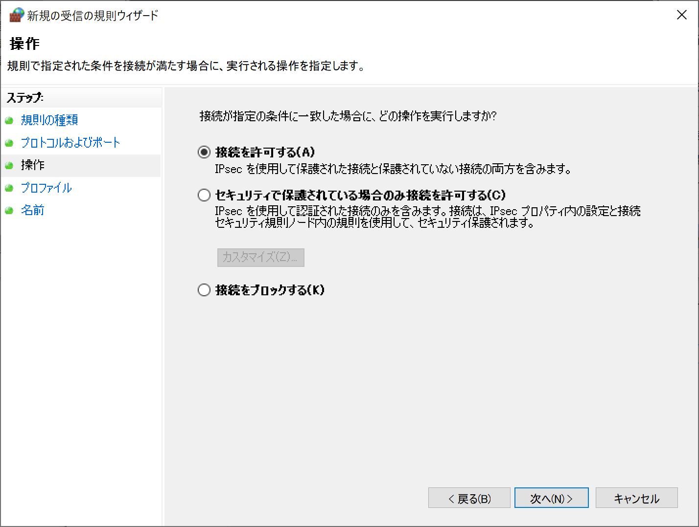 | ”接続を許可する”を選択して「次へ」ボタンをクリックします。 |