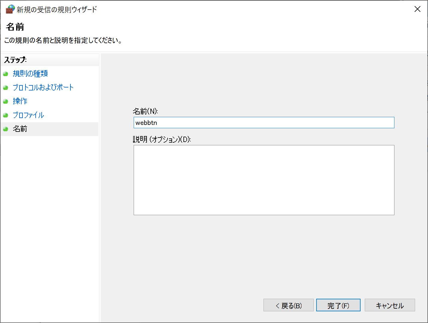 | 名前を記載します。”webbtn”と記述して「完了」ボタンをクリックします。 |