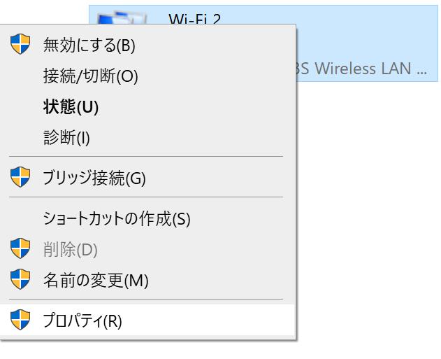 | 使用しているアダプターを右クリックして、”プロパティ”を選択します。 |
