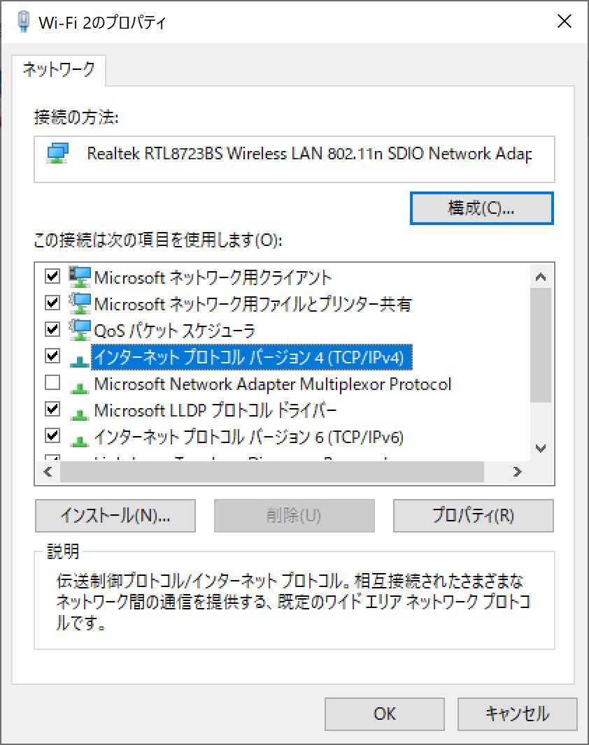 | ”インターネットプロトコルバージョン4(TCP/IPv4)”をクリックします。 |