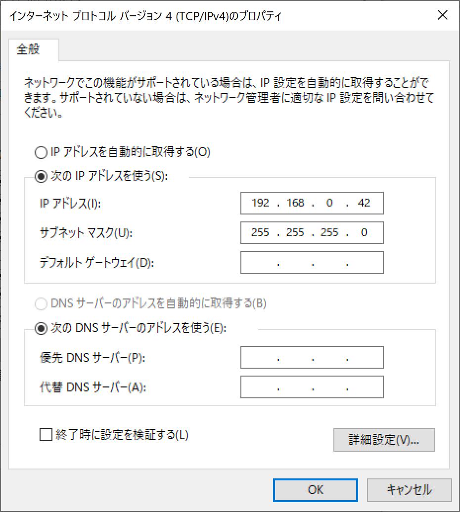 この例では192.168.0.42というアドレスと255.255.255.0のサブネットマスクを設定してます。