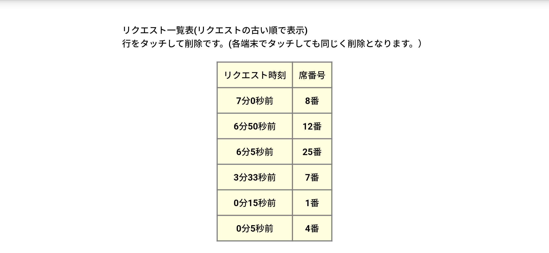 | リクエスト一覧表が表示されます。リストが長い場合はスクロールできます。リクエストが何分何秒前だったかと、席番号が表示されます。新たなリクエストがあった場合には自動的に更新されて音が鳴ります。リクエストは古い順で表示されます。 |